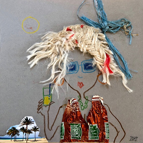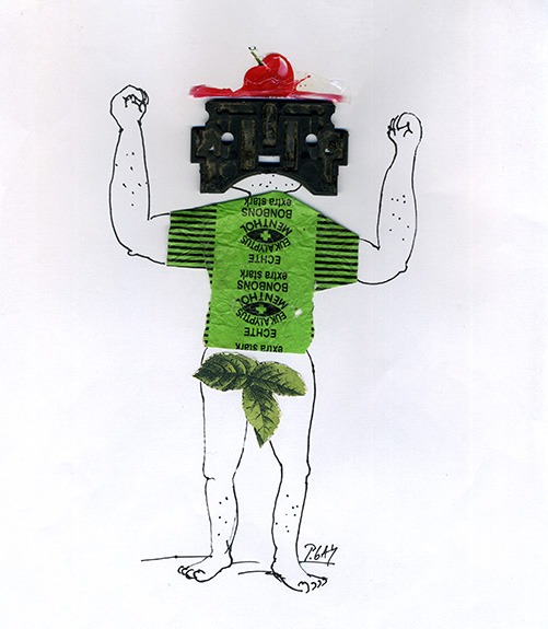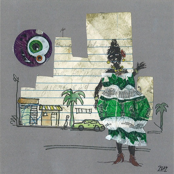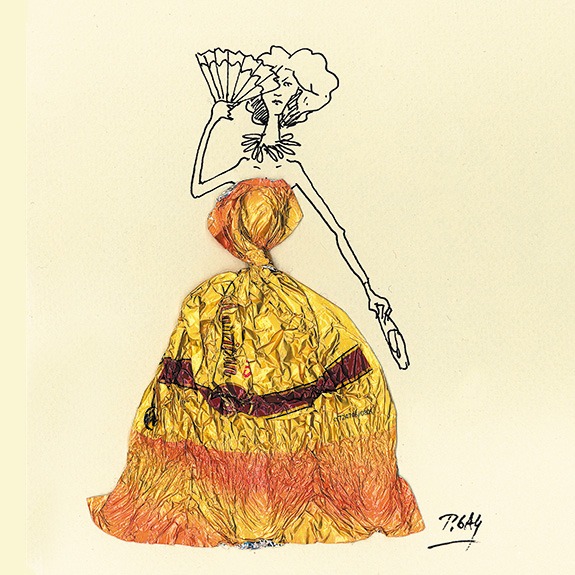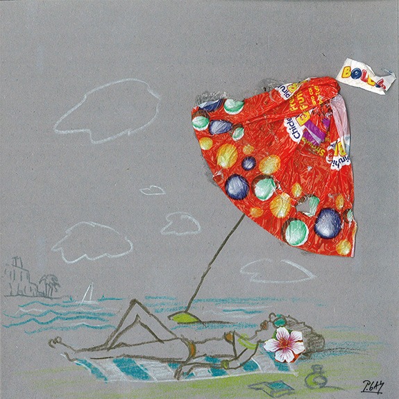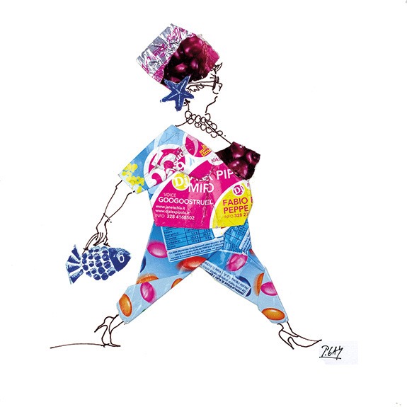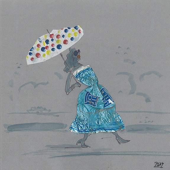 Bonbonpapiere, Haargummis, Kronkorken, Blätterwerk… der Cartoonistenblick sieht eine bunte Welt aus Farben und Synthetik, modische Stoffe und heiße Outfits.